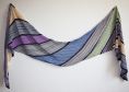 Sowohl die Farb- als auch die Muster-Streifen verlaufen nicht parallel zu den Seiten des Tuches, sondern bilden einen 45ᴼ zu seinen Seiten. Das Tuch hat keine geraden Enden. Es läuft in Zipfeln aus, wodurch das Tuch länger wirkt, als es tatsächlich ist. Die Zipfel sorgen dafür, dass – egal wie es drapiert wird – das Tuch locker fällt und richtig schön lässig wirkt.