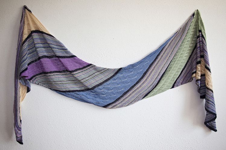 Das Tuch wird –so wie es in dieser Anleitung vorgestellt wird - aus einfarbigen Garnen in 5 verschiedenen Farben gestrickt. Die Mischung der Muster und der Farben macht es zu einem fröhlichen Sommertuch für sonnige Tage. Jeder der Streifen ist relativ schmal – was das Tuch zu einem idealen Projekt für die Verarbeitung von Garnresten macht. Sie brauchen nur wenig Garn für einen Streifen – und Sie können beliebig viele verschiedene Farben in dieses Tuch einbinden. Sie können Sie auch kleinere Garnreste in diesem Tuch verarbeiten – und das Tuch wirkt trotzdem wie aus einem Guss. Das empfohlenen Garn ist ein dünnes Filetgarn aus Baumwolle. Die Anleitung enthält zusätzlich die Empfehlung für ein ebenso dünnes Merino Garn. Lassen Sie sich davon nicht abschrecken! Dieses Tuch kann auch mit deutlich dickeren Garnen stricken, ohne dass es seine Wirkung verliert.