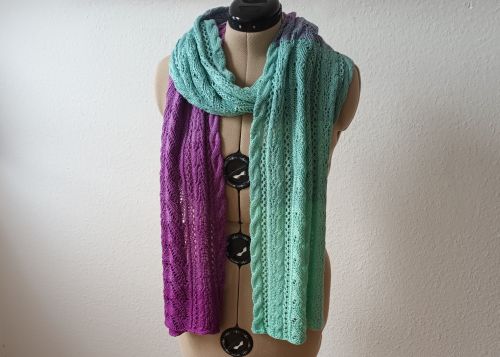 Du solltest für diesen Schal aber auf jeden Fall Strickerfahrung mitbringen und schon Zöpfe und Lochmuster gestrickt haben, außerdem Strickschriften lesen können.