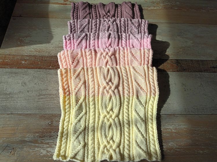 Die Anleitung umfasst 9 bebilderte Seiten, mit genauen Erklärungen zu den Mustern, ein Tutorial zum überkreuzen/verzopfen von 2 Maschen ohne Hilfsnadel und natürlich einer Strickschrift.