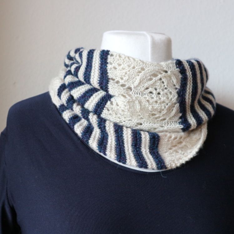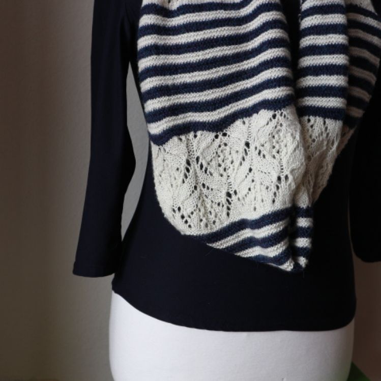Material: Farbe A: 1 Strang Madelinetosh Merino Light (creme) oder ein anderes Garn, dass in etwa die selbe Maschenprobe hat und Farbe B 2 Knäul Alpaca von Drops (dunkelblau).