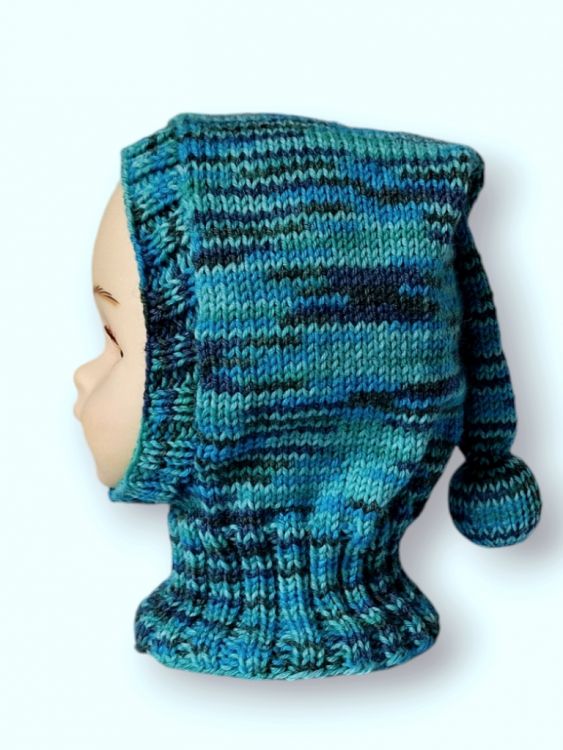 Diese Schal- oder Schlupfmütze ist für Babies und Kleinkinder für ca. 6 bis 18 Monate passend. Schlupfmützen sind deshalb so ideal, da sie Kopf und Hals immer schön warm halten, ohne dass die Mütze so leicht verloren geht. Sie kann problemlos von etwas geübten Anfängerinnen gestrickt werden. Verwendet wurde hierfür eine 6-fach Sockenwolle. Ebenso geeignet wäre Cool Wool Big von Lana Grossa, Merino 120 von Lang Yarns oder Merino extrafine von Schachenmayr. Gerade bei der Verwendung von Merinowolle sind die zarten Babyköpfchen ideal eingepackt. Die detaillierte Schritt-für-Schritt-Anleitung beschreibt jede zu strickende Runde und Reihe ganz genau. Der Bommel wurde mit Füllwatte geformt, da herkömmliche Bommel sich leicht in der Waschmaschine auflösen.
