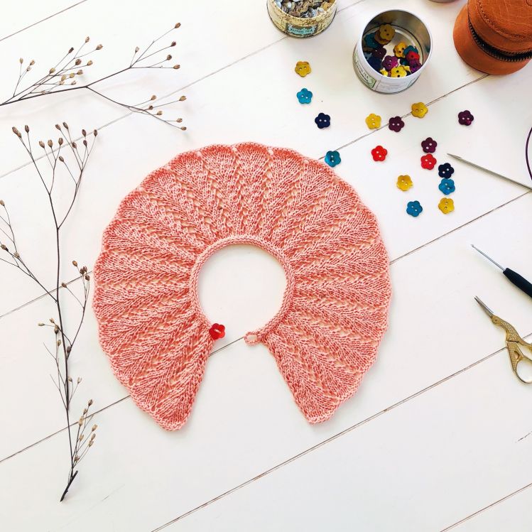 Der Strickkragen wird von unten nach oben zum Hals durch Abnahmen in den jeweiligen Musterabschnitten gestrickt. Am Ende beim Halsausschnitt wird mit einem I-Cord-Rand (oder mit der einfachen Variante durch normales Abketten) abgenommen. Dem Kragen ziert vorne in der Mitte ein kleines Knöpfchen, mit welchem der Kragen geschlossen wird.