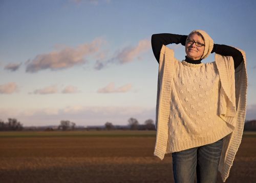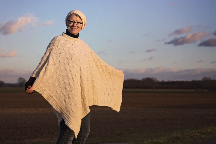 Das Regentropfen-Muster sieht sehr raffiniert aus – ist jedoch relativ einfach zu stricken. Auch Anfänger mit ein paar Grundkenntnissen können sich an dieses Muster wagen. Zu Beginn eines Strickprojektes mit einem bisher unbekannten Muster, muss man die Strickschrift neben die Arbeit legen, da man die nächsten Schritte immer wieder nachlesen muss. Erst wenn man das Rhythmus und die Systematik, die hinter dem Muster steht, begriffen hat, kann man das Muster auswendig stricken. Ich versuche diese „Anlernphase“ für Sie so kurz wie nur irgendwie möglich zu machen. Die Methode, die mir dazu verholfen hat, das Muster frei stricken zu können, wird ausführlich erklärt. Um den Poncho und das Muster stricken zu können, müssen Sie wissen, wie man Maschen anschlägt und abkettet, wie man rechte und linke Maschen strickt und wie man Maschen zusammenstrickt. Alle anderen genutzten Techniken werden in der Anleitung erklärt.