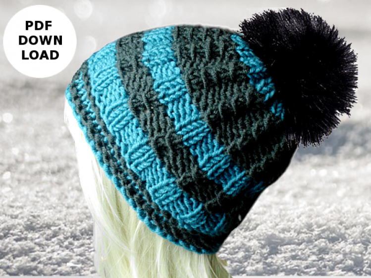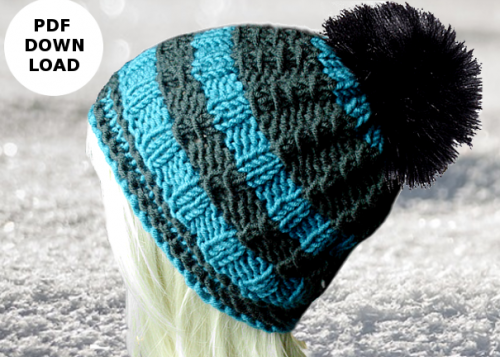 Hübsche 2-farbige Mütze, mit und ohne Bommel tragbar und aus dicker Wolle schnell gestrickt. Das dichte Maschenbild hält super warm.