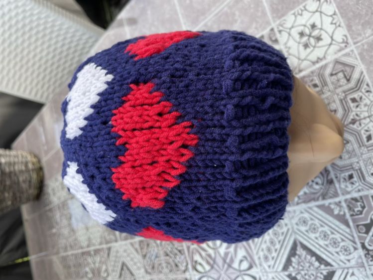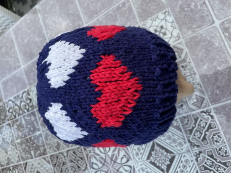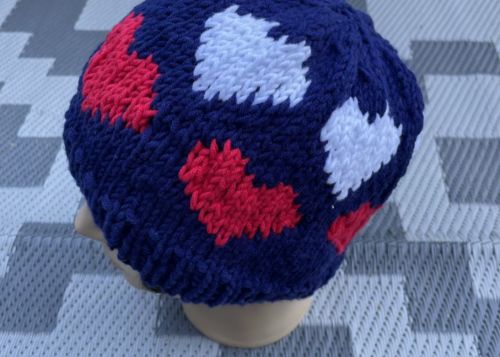 Mit zusätzlichen Maschen zwischen den Herzchen-Mustern kann die Mütze auch in einer größeren Größe gestrickt werden.