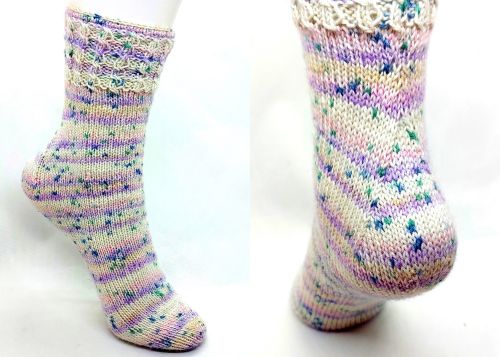 Maschenprobe: 4-fach Sockenwolle, Nadelspiel mit der Nadelstärke 2,5 mm, 10 x 10 cm = 47 Reihen und 32 Masche Masche.