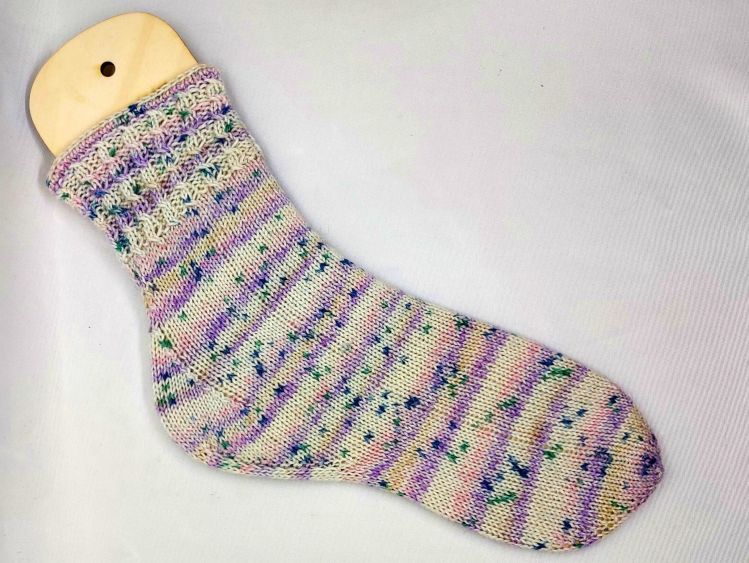 Mein verwendetes Garn für die Fixe-Quicky-Ferse ist „Silk color, 4-fach von Regia“. Meine Socke hat Gr. 37 Verbrauch ca. 60g/Paar. 100g/400m.