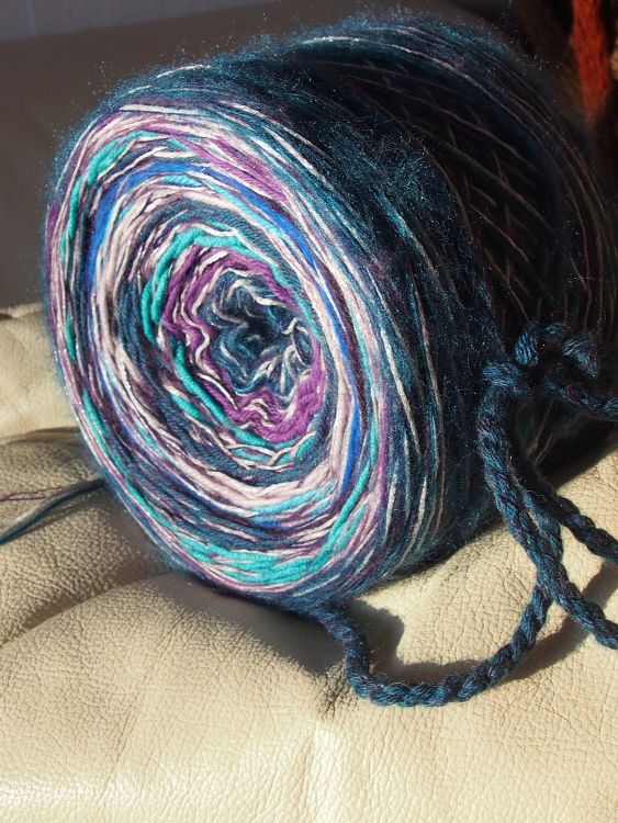 Verarbeitet wurden hier eine ganze Reihe von Resten, die ich mit 3 Fäden Konen-Garn zu einem Bobbel verarbeitet habe. Das dicke, kuschelige Garn habe ich mit Nadelstärke 5 verarbeitet.