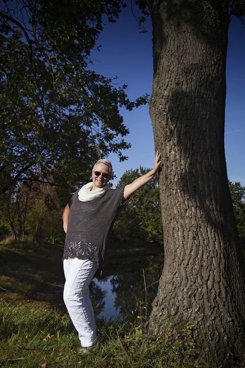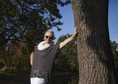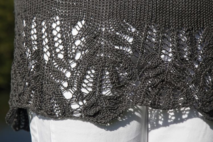Die Eisblumen Tunika ist ein legeres Top, dass zu so ziemlich jeden Anlass passt. Sie kann als kurzärmeliges Sweatshirt getragen werden – sieht aber auch als eine Art Pullunder über einem langärmeligen T-Shirt gut aus. Der Blickfang ist eine breite Borte im Eisblumen Muster, die den unteren Saum bildet. Die Linie des Saums ist unsymmetrisch: Das Rückenteil ist länger als das Vorderteil. Diese Form erhält die Tunika durch den Einsatz von verkürzten Reihen . Diese Technik wird ebenfalls für die Schulterschrägung und den Halsausschnitt verwendet.