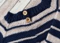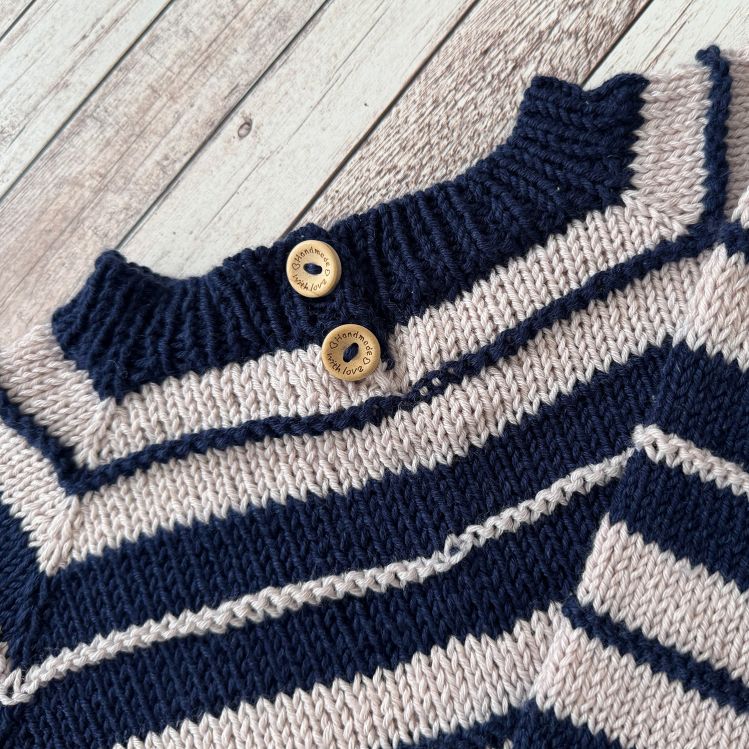 Der Pullover wird mit Hilfe einer Raglankonstruktion in einem Stück gearbeitet und hat im Nackenbereich 2 Knöpfe für ein einfaches An- und Ausziehen.