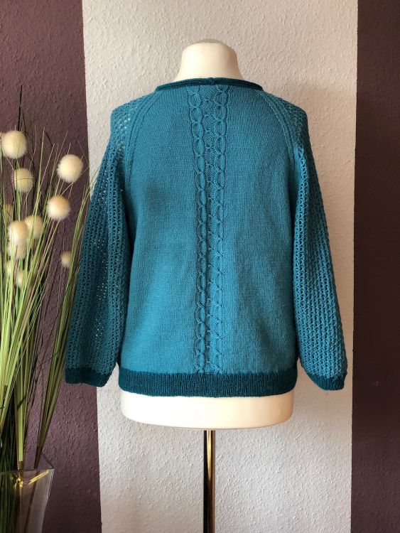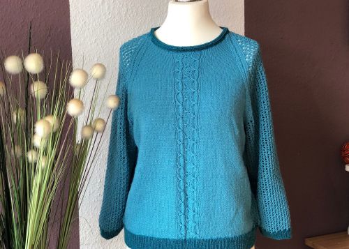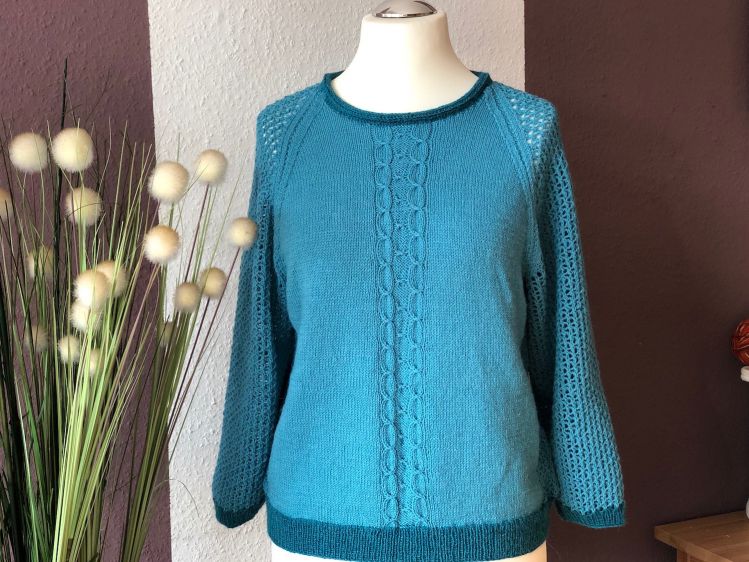Dieser tolle Raglanpullover besticht durch seine dekorativen Akzente. Ein dezentes Zopfmuster am Vorder- und Rückenteil verleiht schlichte Eleganz. Das Netzmuster an den Ärmeln findet sich in schmalen Streifen seitlich wieder. Mit dem icord-Abschluss am Halsausschnitt wird dein neuer Pullover ein absoluter Hingucker!