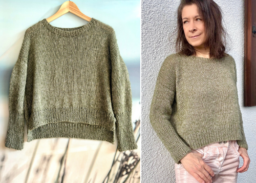 Ich habe ihn doppelfädig gestrickt aus einem Mohair- und einem Merino-Seidengarn. Damit ist er mit nur 190 g (in Größe 4) ein absolut kuschelweiches Leichtgewicht!