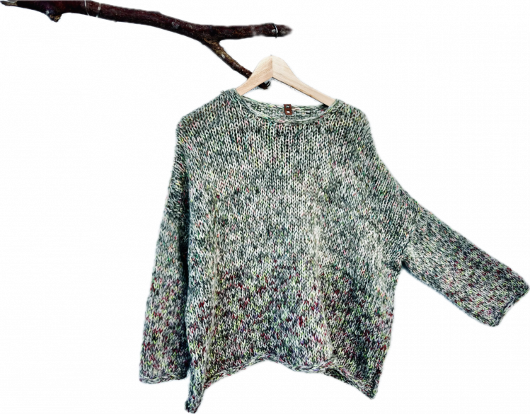 Dieser Pullover ist groß, kuschelig und ohne viel Schnickschnack einfach und schnell zu stricken. Du kannst verschiedene Garne oder Reste – unbedingt auch flauschig – gleichzeitig verstricken. Schnapp Dir eine richtig dicke Stricknadel und probiere es aus. Ich kann Dir versprechen: Kein Pullover wird dem anderen gleichen! Und als Bonus: Das Stricken geht superschnell von der Nadel.