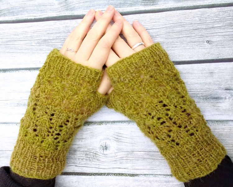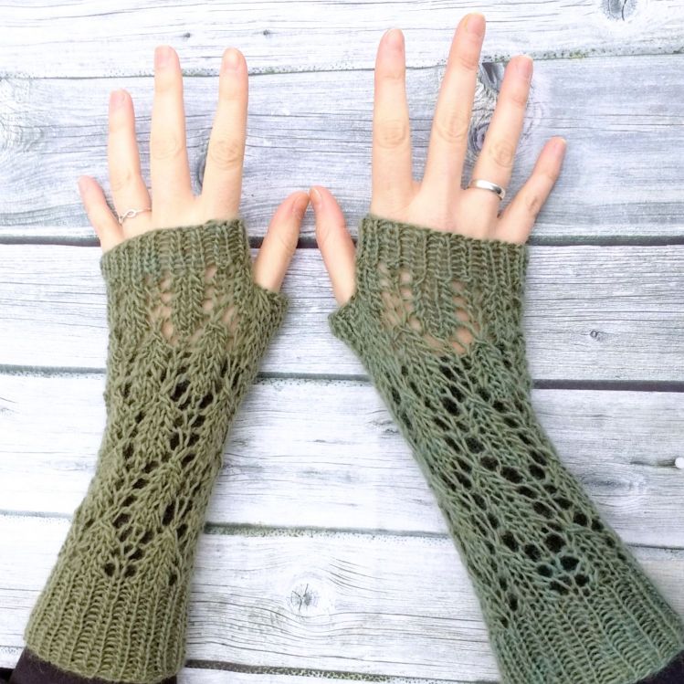 Prisca Pulswärmer 4 (oliv): ca. 25 g Laines du Nord Poema (600 m/150 g, Verbrauch: 25 g und 100 m), Nadelspiel 4 mm; Nadelspiel 4,5 mm; ein Maschenmarkierer
