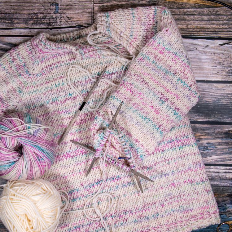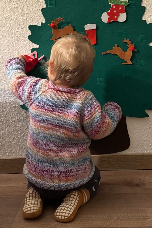 Bei dieser Anleitung handelt es sich um einen sehr warmen Pullover, welcher dank der RVO Konstruktion an einem Stück gestrickt werden kann. Die Anleitung kommt in 4 Größen (62/68, 74/80, 86/92, 98/104). Das dichte Maschenbild kommt dadurch, dass zweifädig gestrickt wird. Der Pullover ist auch optimal für kühle Herbst und Frühlingstage geeignet.