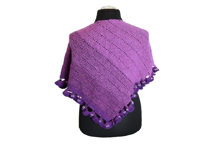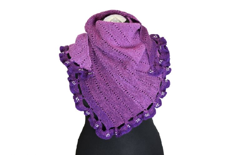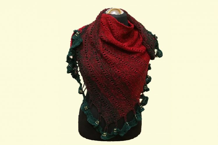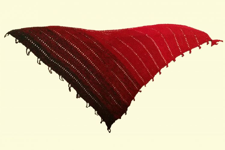 - Farbverlaufsgarn 4-fach (für die Originalgröße), auch dickeres Garn möglich, denn die Borte kann individuell angepasst werden an die Größe des Körpers. Lauflänge ca. 900 Meter (weniger ergibt ein kleineres Tuch, mehr ein größeres). Nadelstärke siehe Maschenprobe für 900m 4-fach.