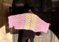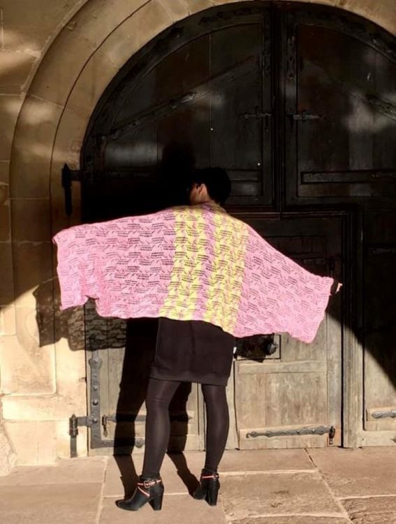 Die große Fassung in Pink und gelben Streifen ist mit 250g gestrickt und kann auch als Seelenwärmer getragen werden, dafür habe ich sehr kleine Druckknöpfe am Rand angenäht.