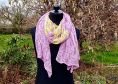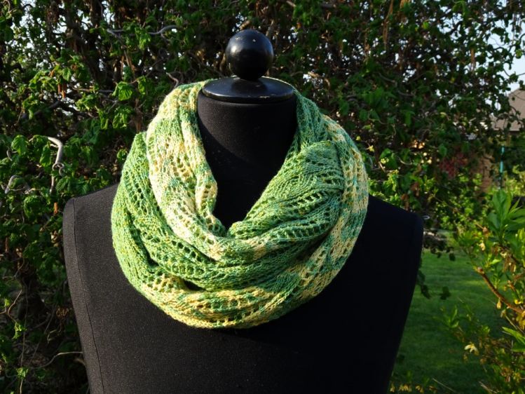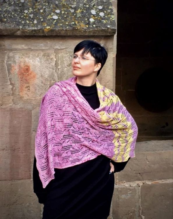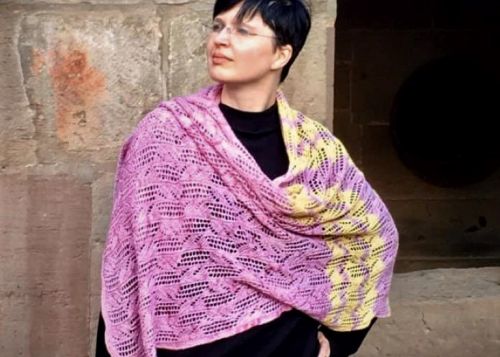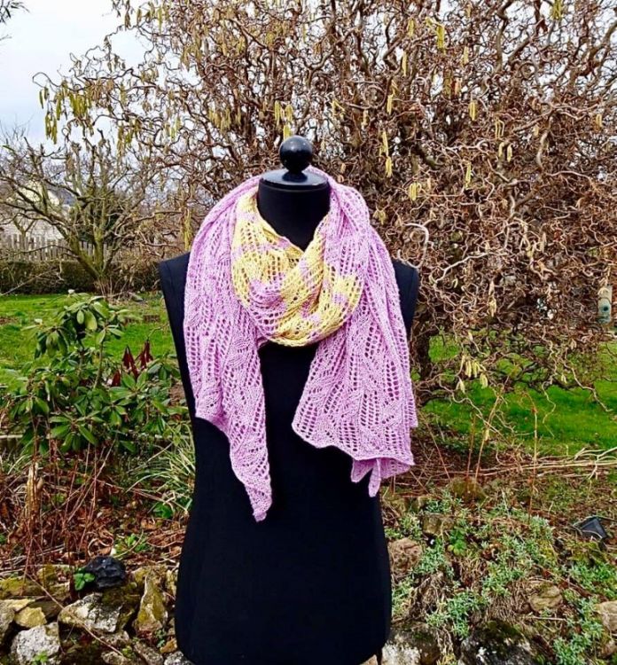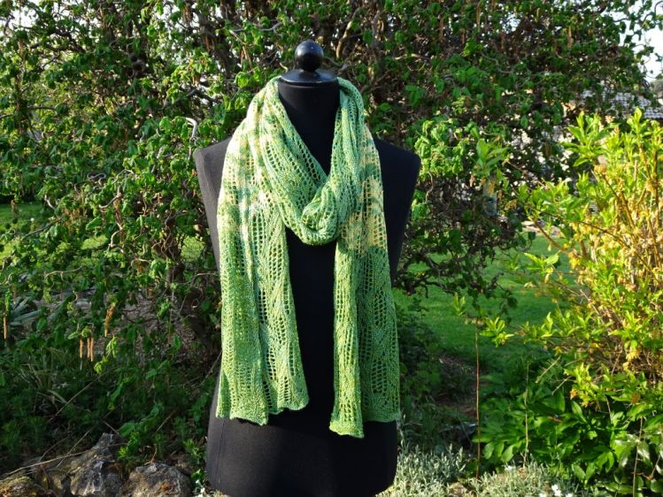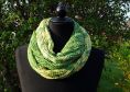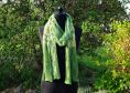 Die kleinere Fassung in grün/gelb ist ein superleichter Sommerschal aus 150g Seidenblümchen.
