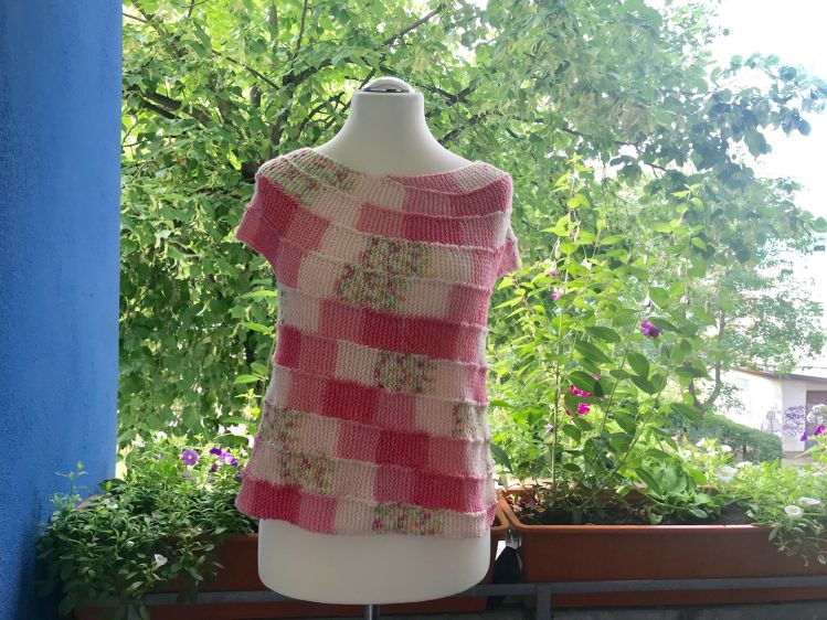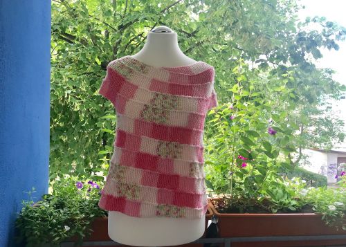 Die Arbeit ist an die 10-stitch-Technik angelehnt, d.h. du hast selten mehr als 10 Maschen auf der Nadel. Durch das Farbverlaufsgarn entsteht dann dieses sensationelle Muster. Es wird spiralförmig von oben nach unten in einem Stück gestrickt.