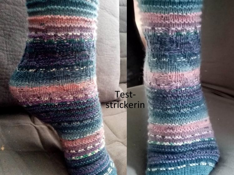 Maschenprobe: 4-fach Sockenwolle, Nadelstärke 2,5 mm, 10 x 10 cm = 40 Reihen und 32 Maschen.