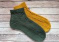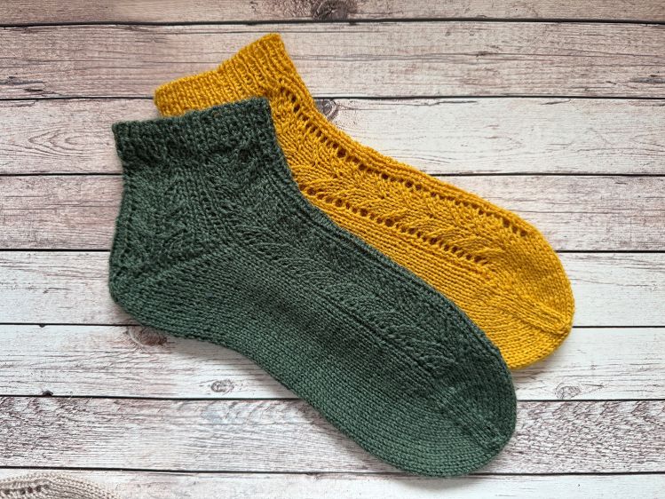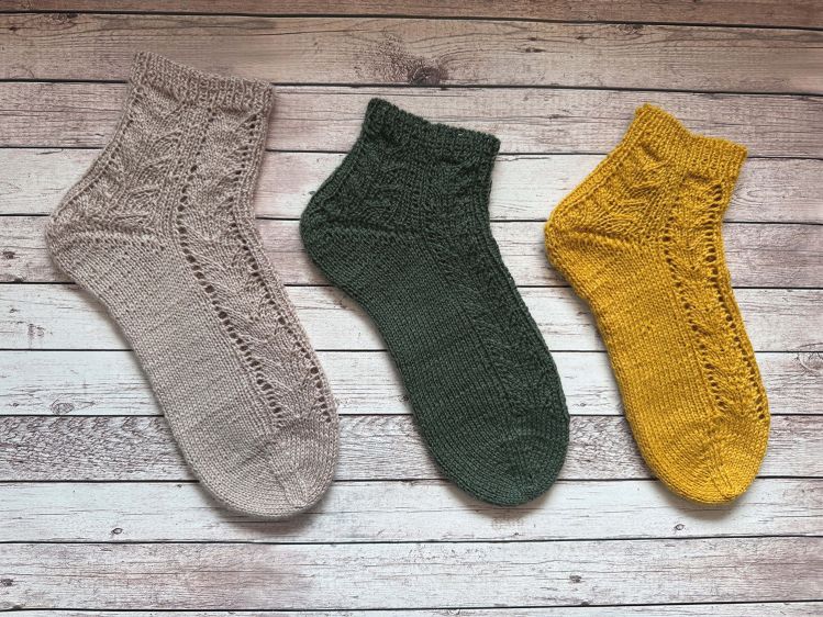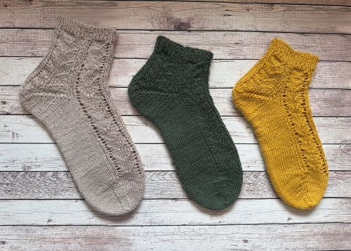 Bei der Anleitung handelt es sich um ein Design mit leichtem Lacemuster, einem elastischem Bündchen und einer Bändchenspitze. Das Muster zieht sich über die obere Hälfte der Ferse. Länge und Weite der Socke kann angepasst werden. Ausgeschrieben ist das Muster für 56, 60 und 64 Maschen.