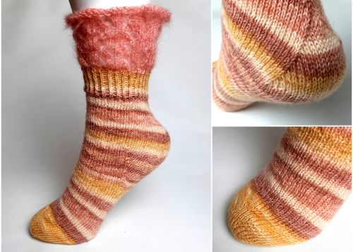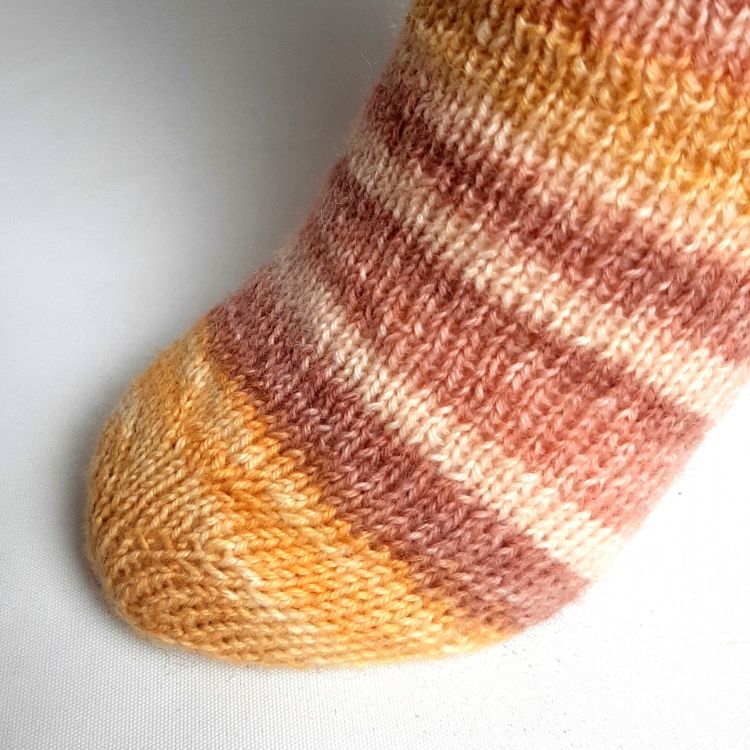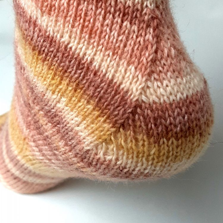 Die Socken werden von der Spitze aus hoch gestrickt. Die von mir entwickelte Fersenform, entsteht durch ein paar ganz einfachen Zu-und Abnahmen.