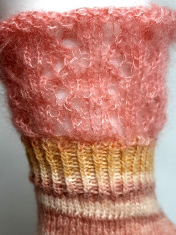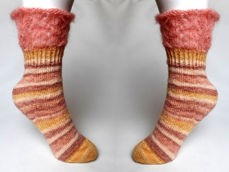 Herausgekommen ist die Quicky Socke "Federleicht" mit der Knospenspitze (s.Bild). Diese Quicky Socke hat einen schönen Schaft mit einem Spitzenmuster aus leichtem Flauschgarn. Bei der Knospenspitze setzen wir die Zunahmen etwas anders als gewohnt und erhalten so eine Fußspitze mit einem leichten Blattmuster (drückt NICHT !). Das Schaftmuster kann auch mit Sockengarn gearbeitet werden.