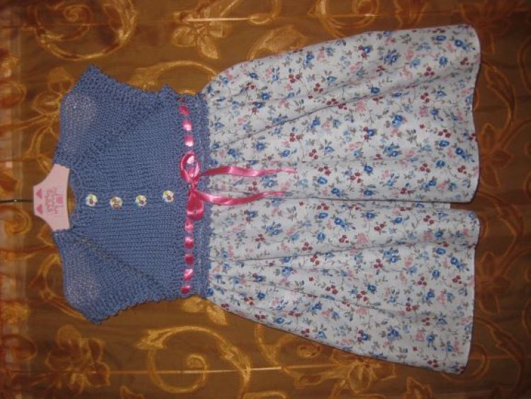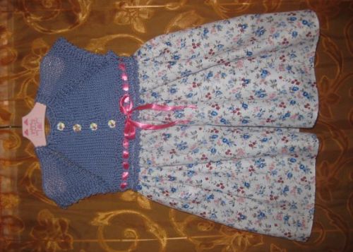 Ina ist eine Kombination aus mit Raglan und Knopfleiste gestricktem Oberteil und angesetztem Rockteil aus Stoff. Die Anleitung ist für Größe 86 geschrieben, kann aber ganz einfach in jeder beliebigen Größe gestrickt werden, die erforderlichen Tipps sind ausführlich beschrieben, ebenso Maßangaben für einige weitere Größen von 98 bis 140.