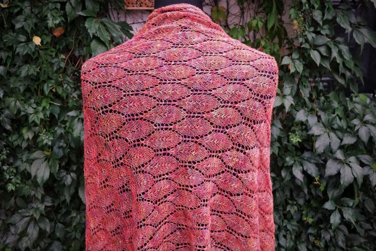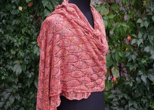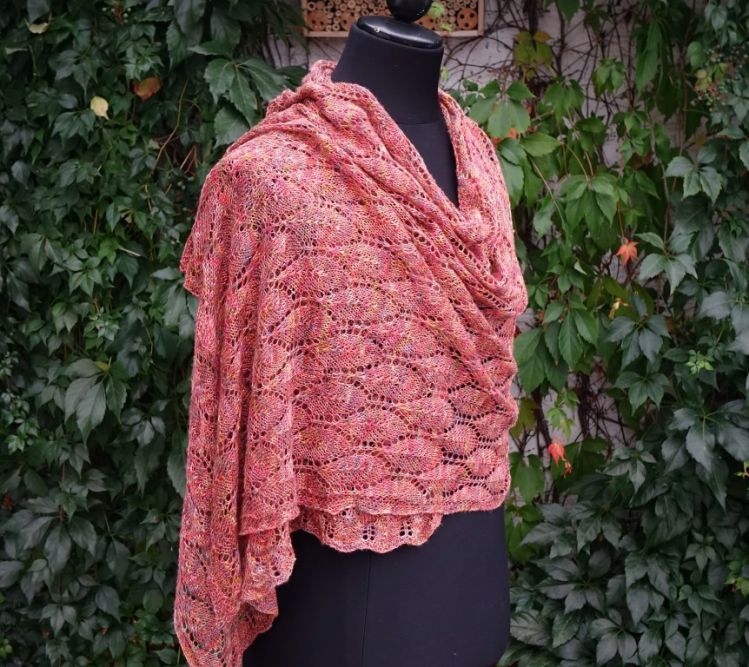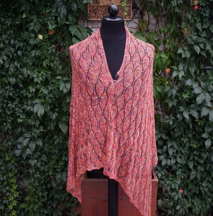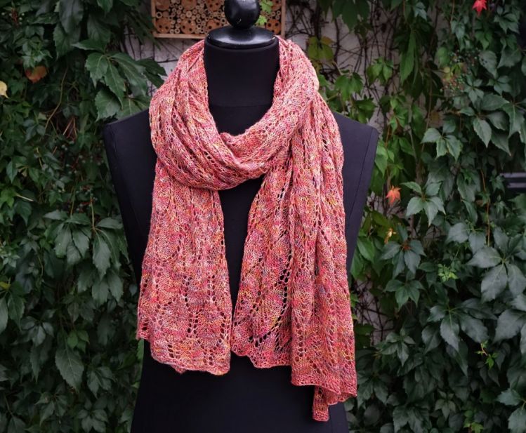 Spicy Autumn ist ein großer Seidenschal mit einer Größe von 67x 165 cm und somit vielfältig zu tragen. Wenn man Druckknöpfe anbringt ist er alternativ auch als Poncho zu tragen. Er ist aus 200g Seide (100% Schappeseide) mit einer LL von jeweils 600 aus der Färbung Gewürzhund von Coonie's Wolle gestrickt. Das Muster ist Zeile für Zeile erklärt und auch als Chart dargestellt und absolut anfängertauglich