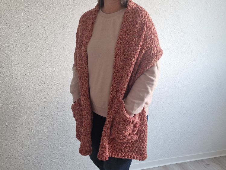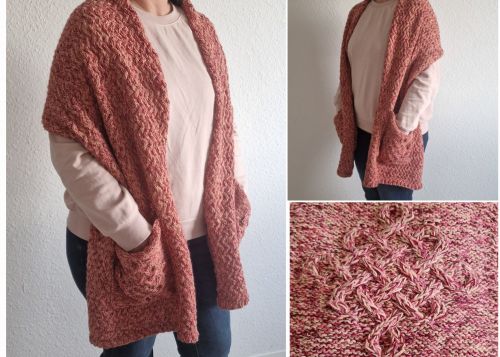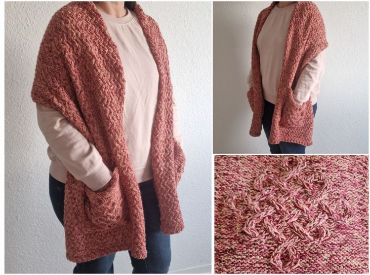 Das Schalmuster besteht aus einem Flechtmuster und als absolutes Highlight findest Du auf den Taschen jeweils einen keltischen Knoten.