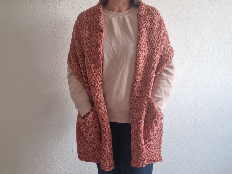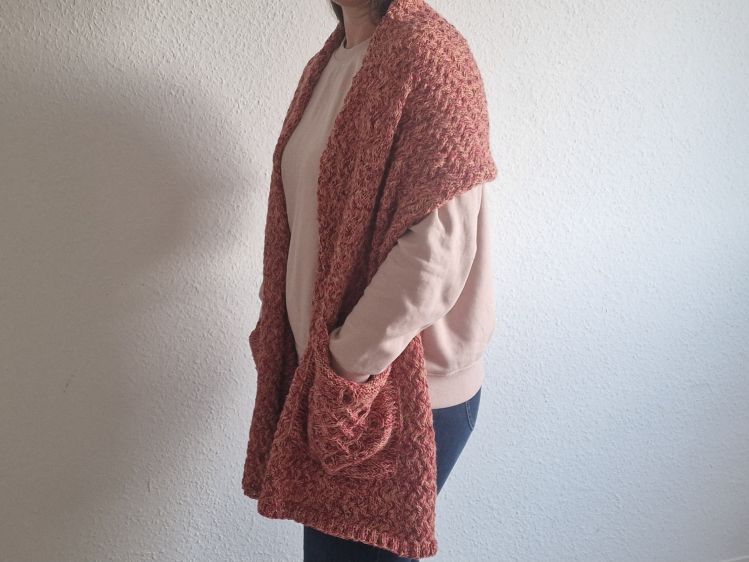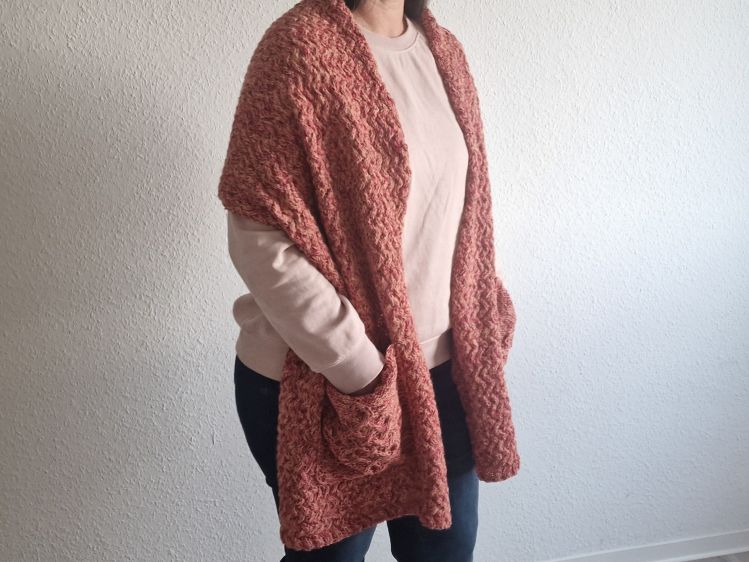 Nach dieser Anleitung kannst Du dir einen absolut hippen und modischen Taschenschal stricken. Er wird ganz einfach wie eine Stola umgelegt, aber durch die Taschen ist er der ideale Begleiter für einen kühleren Abend, wenn Du unterwegs bist und keine Handtasche mitnehmen möchtest oder für den morgendlichen Spaziergang.