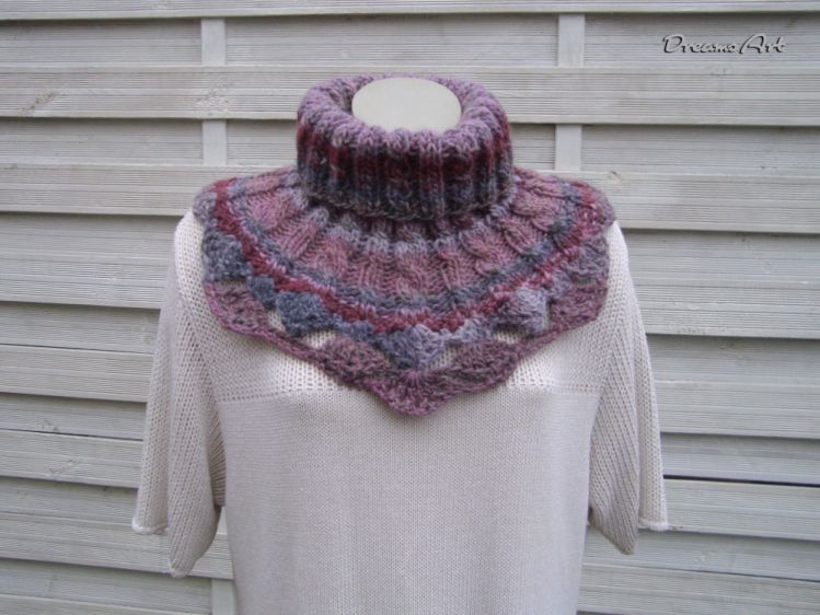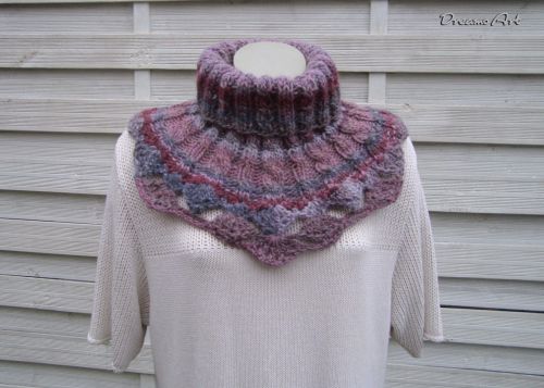 Hier bekommst du in elektronischer Form eine Strick- und Häkelanleitung für einen Schalkragen. Dieser Schalkragen ist asymmetrisch gestaltet, sodass er vorne etwas länger als hinten ist. Dieser Kragen hat als Abschluss eine schöne Häkelborte im Muschel Design.