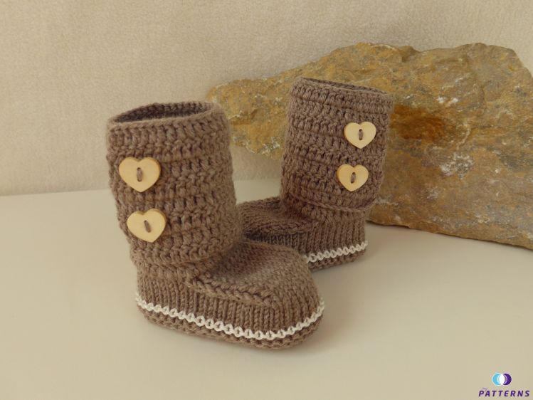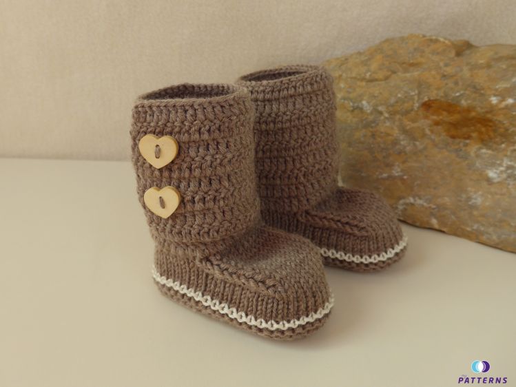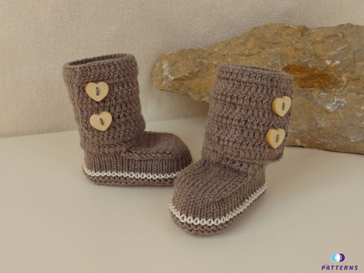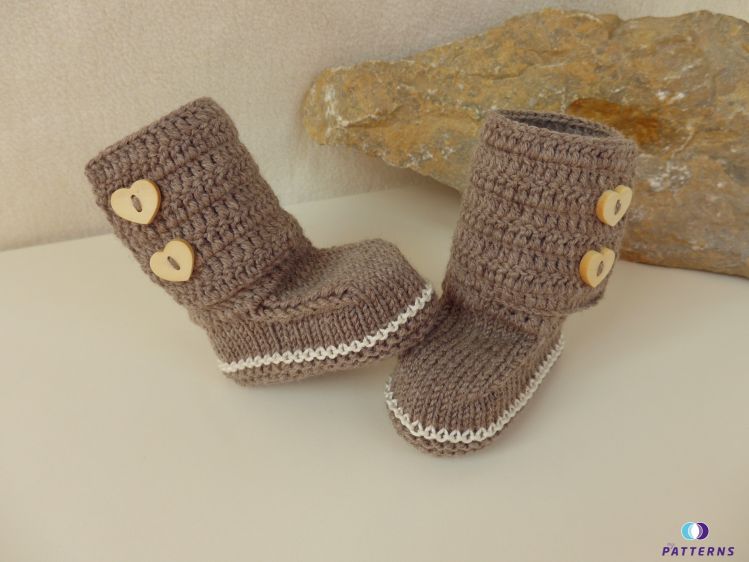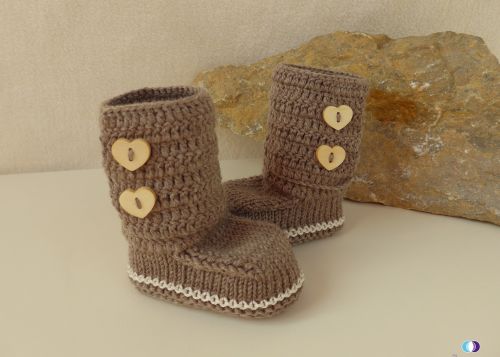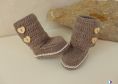 Mit diesen Babybooties gibt es keine kalten Füßchen mehr. Der Fuß an sich wird gestrickt, somit wachsen die Schühchen noch eine Weile mit. Für mehr Stabilität wird der Schaft der Booties gehäkelt. Damit die Schühchen leichter zum An- und Ausziehen sind, kann der Schaft mit der Hilfe der Knöpfe geöffnet und geschlossen werden. Die Babybooties sind garantiert ein Blickfang an Babys Füßchen.