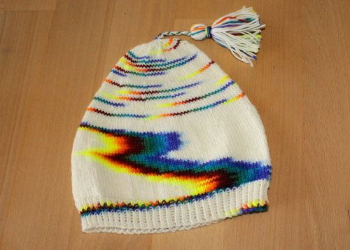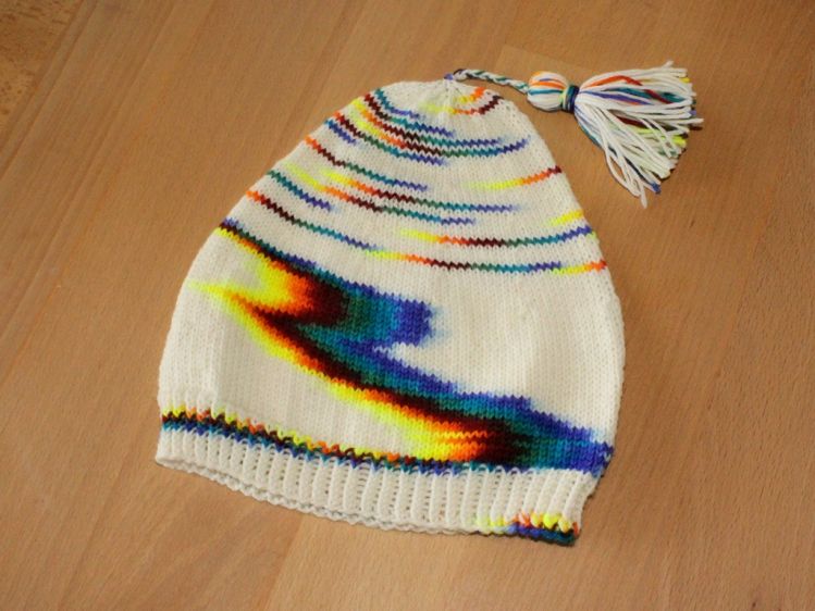 Für Anfänger geeignet., da sich das Muster automatisch aus dem Farbverlauf der Wolle ergibt. Hier wird jede Mütze zum Unikat.