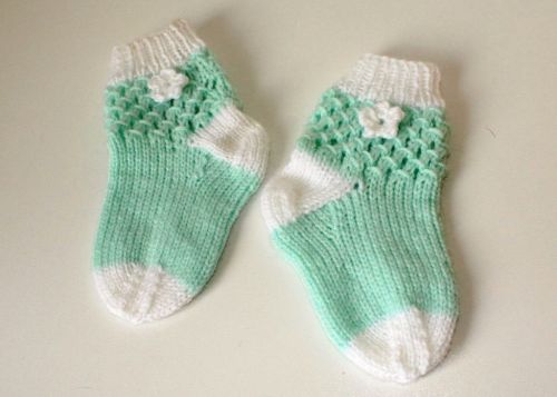 Strickanleitung Babysocken mit Blütenapplikation, ca. 12 cm Hierfür werden lediglich ca. 20 g Wolle mit einer Lauflänge von 185 m / 50 g benötigt (Bravo Baby Smiles von Schachenmayr) - ideal zur Resteverwertung. Sohlenlänge ca. 12 cm - passend für ca. 6 - 12 Monate