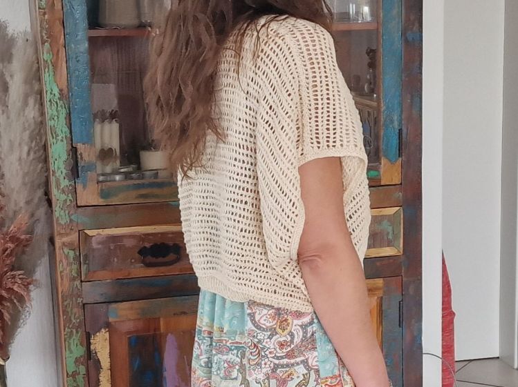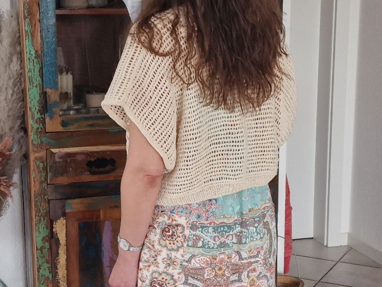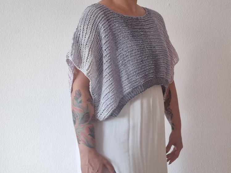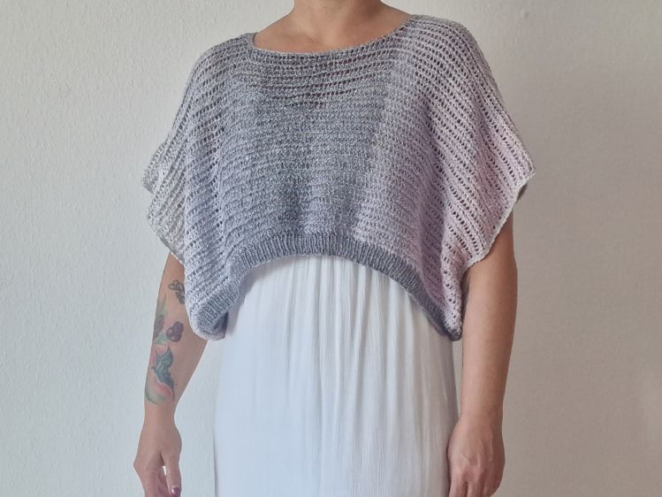 Nach dieser Anleitung kannst Du dir ein sommerliches, oversized Crop – Shirt stricken. Es ist luftig und leicht und es passt super über ein Top oder ein Kleid, wenn es abends doch mal ein bissl kühler ist, Du einfach nur was locker – lässiges zum Drüberziehen suchst oder weil Du deine Arme etwas bedeckt haben möchtest.