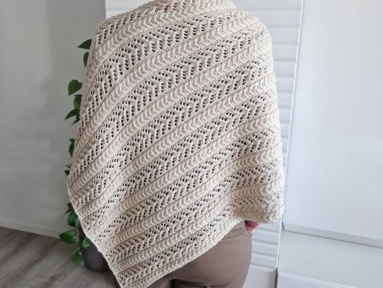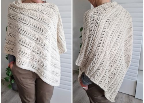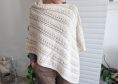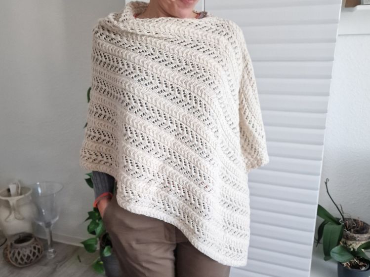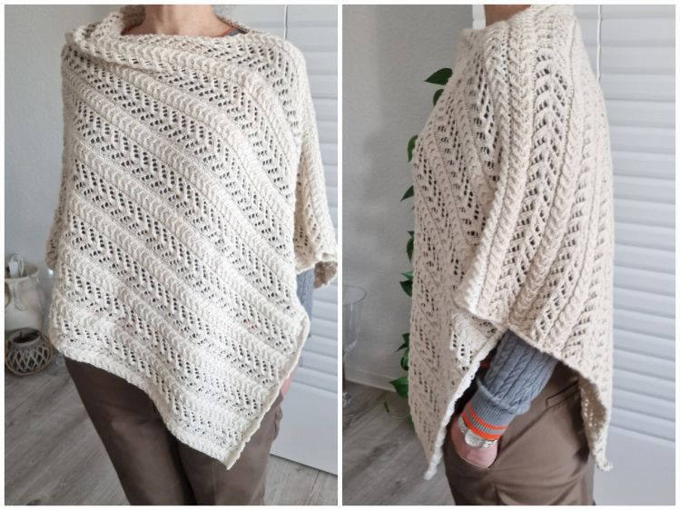 Der Poncho wird in einem Stück, wie ein extrem breiter Schal gestrickt und dann nur noch auf einer Seite zusammengenäht. Das Muster besteht aus einem Zopf, der sich mit einem Ajourmuster abwechselt. Wirkungsvoll und trotzdem nicht kompliziert.