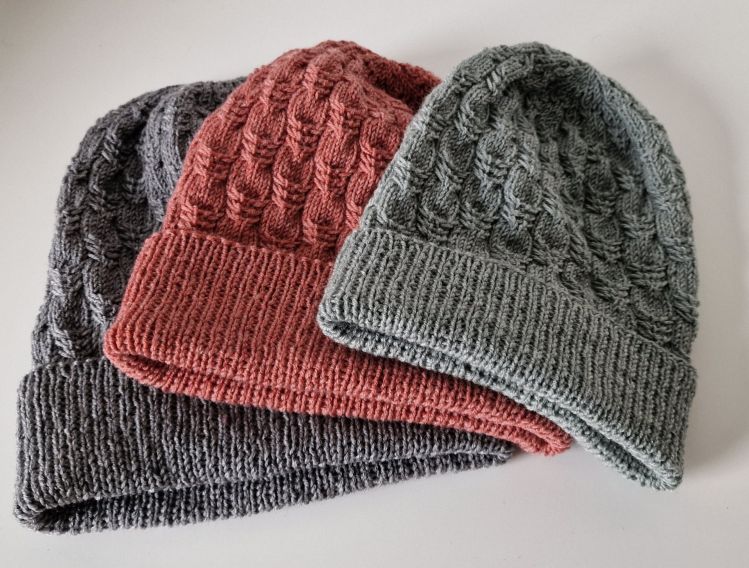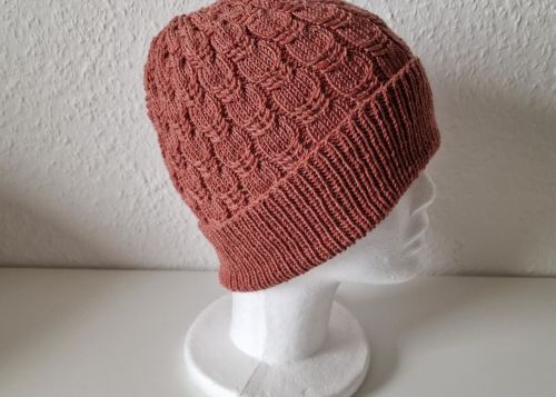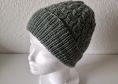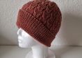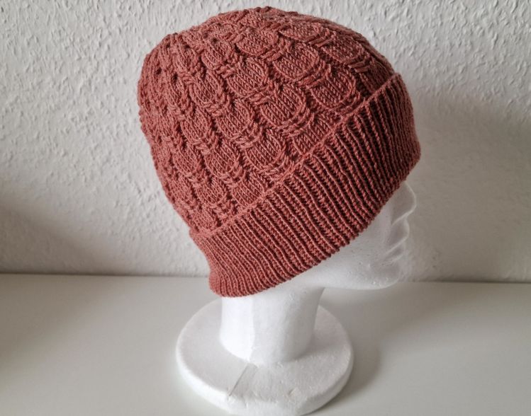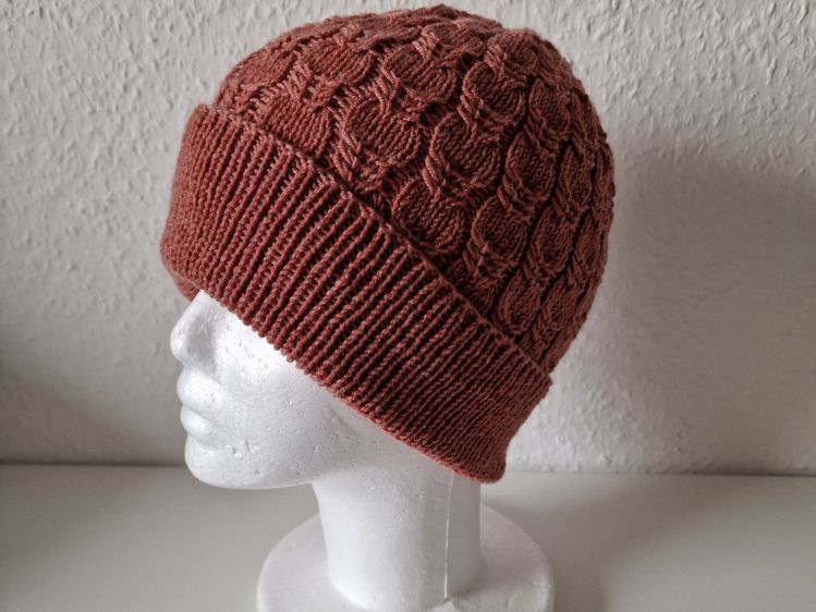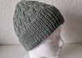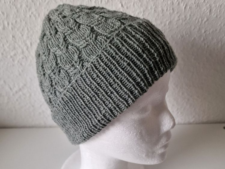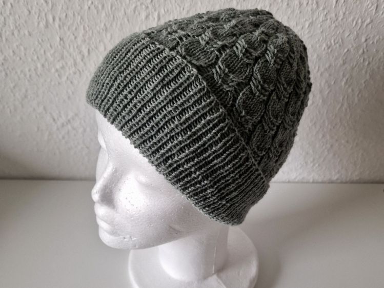 Die Mütze wird in Runden auf der Sichtseite gestrickt. Das Muster ist ein Zopfmuster und wird mit Überkreuzungen gearbeitet.