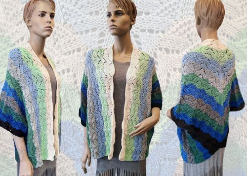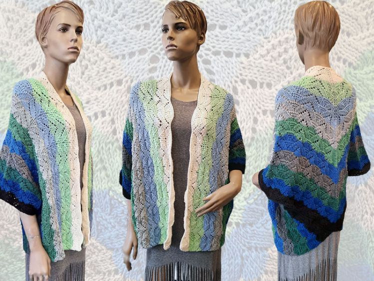 Viktoria ist ein Multitalent. Sie wird an einem Stück gestrickt. Je nach dem wie man sie dann zusammenfügt ist sie eine Jacke, ein Seelenwärmer oder eben einfach ein Überwurf wie eine Stola.
