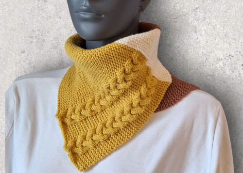 Dieser Schalkragen mit Zopfmuster ist auf jeden Fall ein Hingucker. Er hält den Hals schön warm und wird nur über den Kopf gestülpt. Mit einem Materialverbrauch von ca. 150 g eignet er sich auch ideal zur Resteverwertung, da hier nahezu mit jeder Wolle gestrickt werden kann. Geeignet für Anfänger-/innen, die bereits erste Erfahrungen im Zopfstricken gemacht haben bzw. ambitioniert genug sind, dies hier zu erlernen.