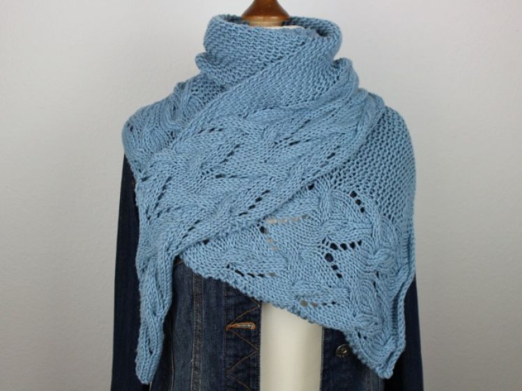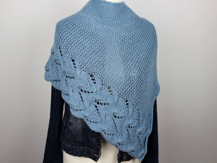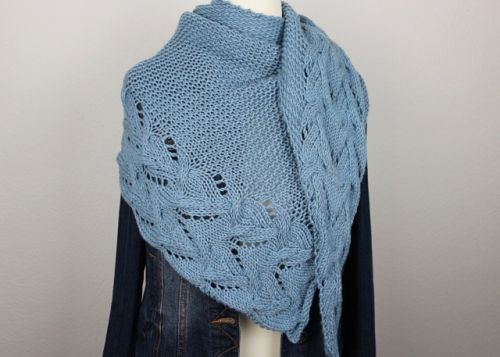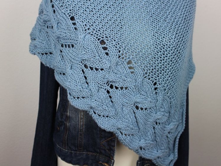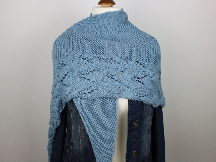 Das Tuch Jeans ist ein asymetrisches Dreieckstuch, dass mit nur wenigen Maschen begonnen wird und sich durch seitliche Zunahmen stetig vergrößert. Die Anleitung enthält sowohl einen Chart als auch geschriebene Instruktionen.