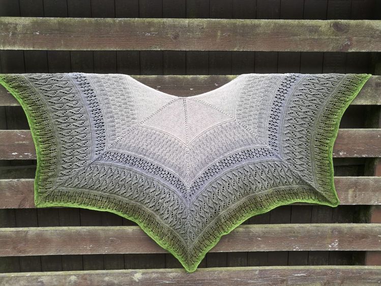Unter Verwendung des angegebenen Materials, einem 3-fädigen Farbverlaufsgarn, erhält das Tuch eine Spannweite von ca. 180 cm und eine Tiefe von ca. 78 cm.