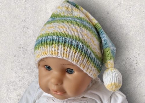 Mit nur ca. 35 - 40 g Wolle ist diese Wichtelmütze ideal zur Resteverwertung. Gestrickt wurde hier mit Bravo Baby Smiles von Schachenmayr. LL ca. 185 m / 50 g. 100 % Polyacryl (waschbar bei 30 Grad).