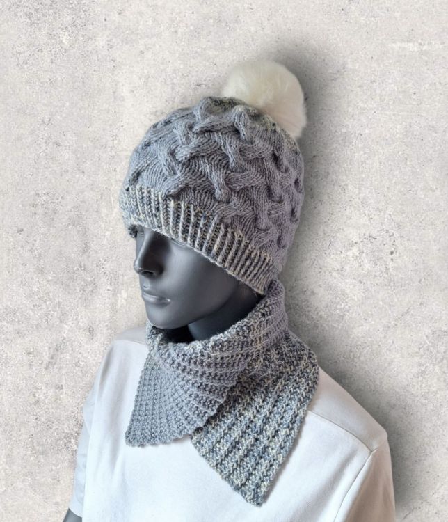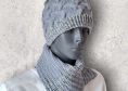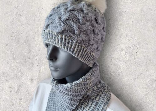 Ideal für die kalte Jahreszeit ist dieses Set, bestehend aus einer Mütze mit einfach zu strickendem Zopfmuster und einem Kunstfell-Bommel und einem Schalkragen, der den Hals schön warm hält.