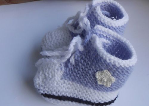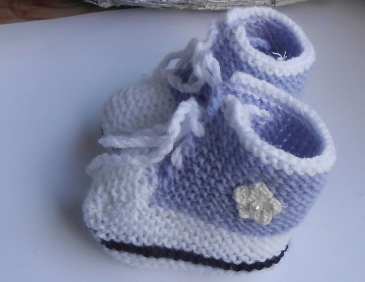 Die Schuhe für die kleinen Füsse sind wirklich praktisch und dazu noch schön. Sie sind mit meiner Anleitung super zu stricken. Fotos führen durch die Arbeit. Natürlich können Sie diese in allen Farben stricken. Sie brauch einen Rest schwarz, hier hellblau und weiss. Je ca. 30 g