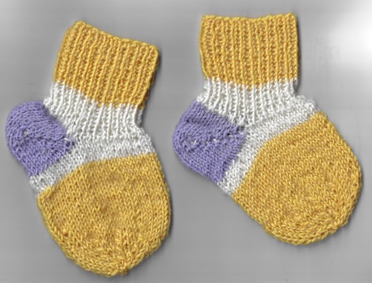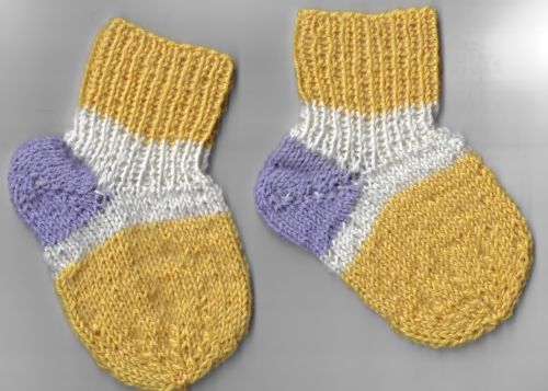 Die Socken lassen sich mit einer ganz einfachen Ferse stricken. Sie können auch super aus Wollresten gestrickt werden. Sie müssten ca. von 3-6 Monaten reichen, ja nach Fuss des Babys.