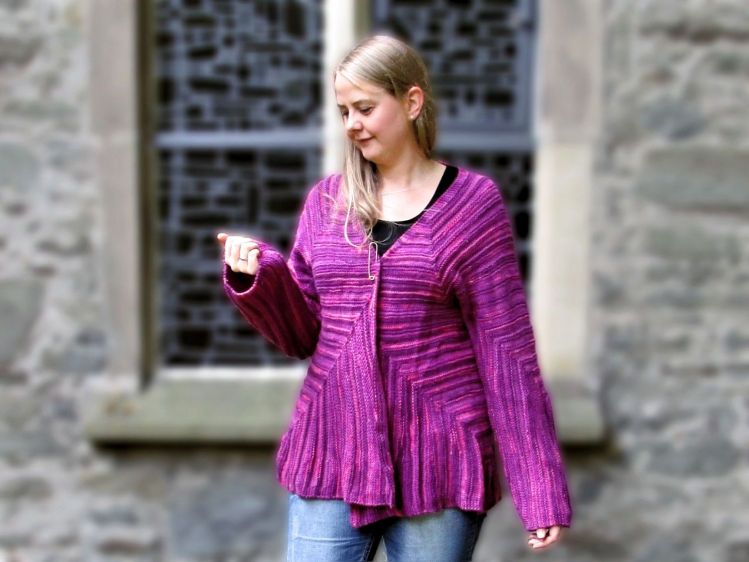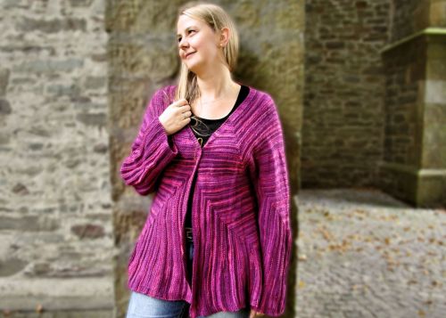 Die Sustrum Jacke und Tunika wird in Strick-Patchwork-Technik gestrickt, mit zwei verlängerten Doppel-Patches und verkürzten Reihen für genügend Weite unten und einem Vierer-Patch als Passe, damit sie schön sitzt.