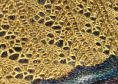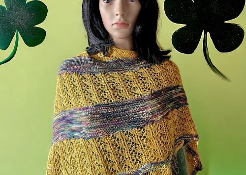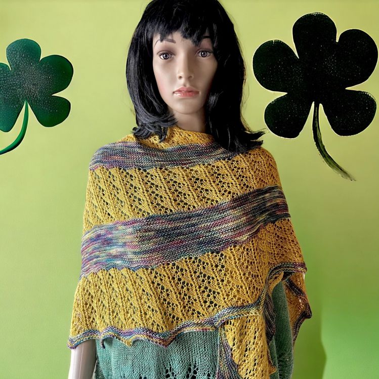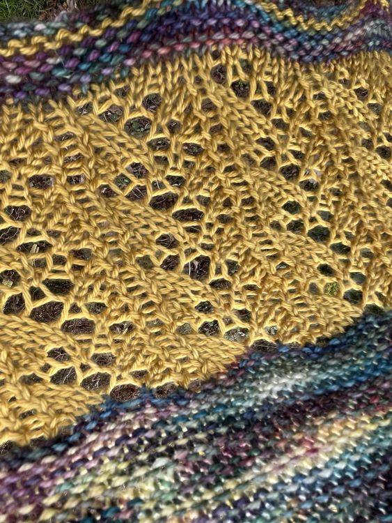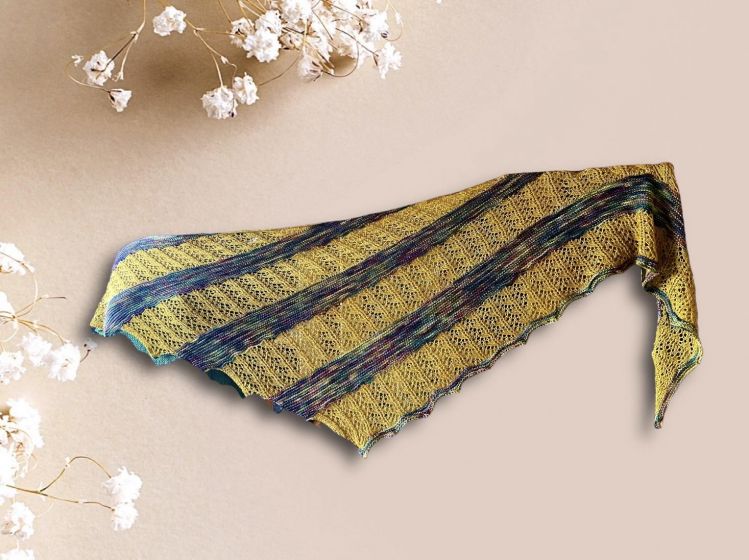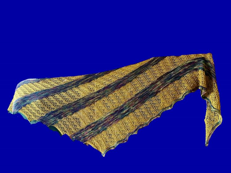 Marie ist ein einfaches 2farbiges Dreieckstuch. Es erhält seine Form durch stetige Zunahmen auf einer Seite und durch regelmäßige Abnahmen auf der anderen Seite. Es ist mit einem unifarbener Wolle (Silkenmer von Fiberpassion) und einem melierten 100g Strang Wolle Alegria, gefärbt von Wollfeuerwerk. Mit der unifarbenenen Wolle wird ein einfaches Lochmuster gestrickt und mit der melierten Wolle werden kraus rechts gestrickte Streifen gestrickt.