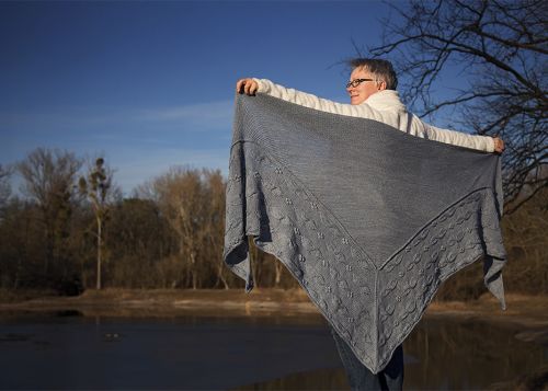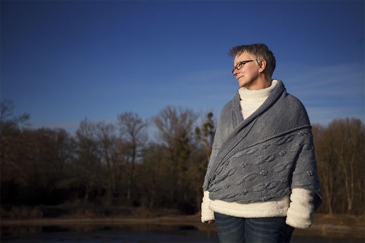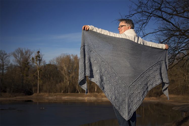 Das Aquarius-Tuch ist ein symmetrisches Dreieckstuch, das von der unteren Spitze aus gestrickt wird. An den kürzeren Seiten verläuft eine dekorative Borte mit einem Zopf-Noppenmuster bis zu den äußeren Spitzen des Tuches. Die Mitte des Tuches bildet eine Fläche, die krausrechts gestrickt wird.